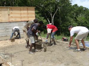 As with most trips to Jamaica, I am quickly reminded of things that I should appreciate back home but have become accustomed to. Today, 2 big things come to mind. #1 – There is a wonderful company in Richland Center called Richland Redi-Mix. We got the electric mostly run very quick today (again thanks to Mark Miller). This meant a full day of helping pour a 3″ inch thick floor across the entire 12 foot by 48 foot coop. As most people who know me can attest, I hate sand especially between my fingers and toes. I hate cement even more. A cement truck would have been awesome but the “Jamaican Cement Mixers” worked hard and fast and got the job done just before the rains. #2 — Reliable running water. When taking a brief break today from the sun, I sat next to the water tank for a few minutes and realized why it was necessary. Every 5 minutes the water would stop running for about 5 minutes. 5 minutes of weak flow sure would make for a very poor shower and without the tank would result in dehydrated chickens. Thanks again for everybody’s support and in a few days, the rest of the crew arrives and the coop should be done quick. Since, the chickens arrive 9/16/13 — we better get moving!