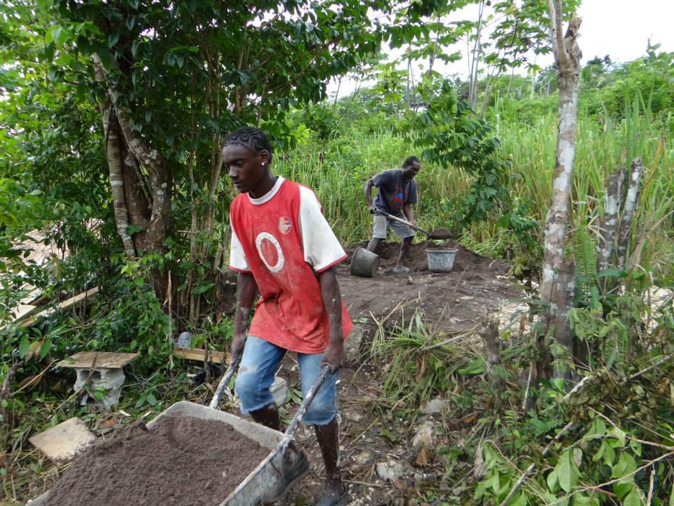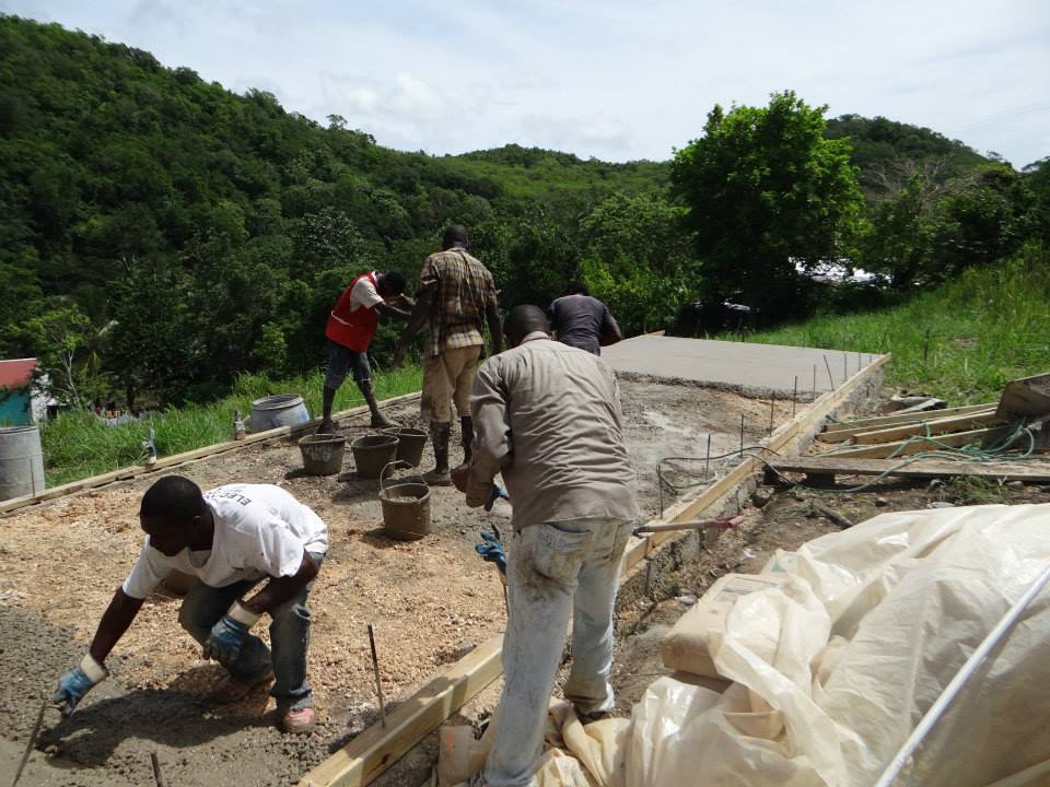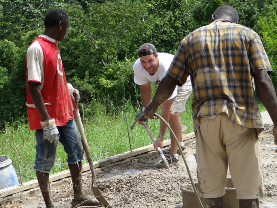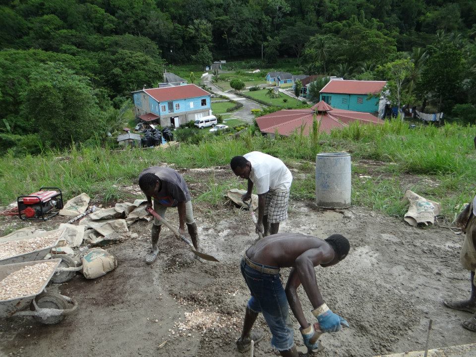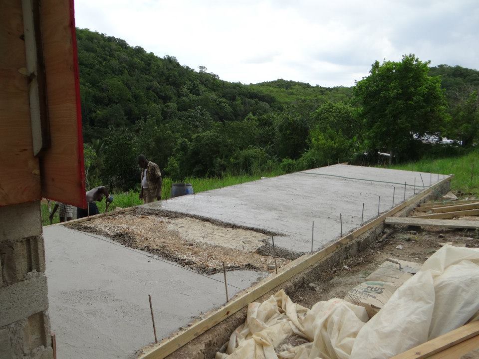 As with most trips to Jamaica, I am quickly reminded of things that I should appreciate back home but have become accustomed to. Today, 2 big things come to mind. #1 – There is a wonderful company in Richland Center called Richland Redi-Mix. We got the electric mostly run very quick today (again thanks to Mark Miller). This meant a full day of helping pour a 3″ inch thick floor across the entire 12 foot by 48 foot coop. As most people who know me can attest, I hate sand especially between my fingers and toes. I hate cement even more. A cement truck would have been awesome but the “Jamaican Cement Mixers” worked hard and fast and got the job done just before the rains. #2 — Reliable running water. When taking a brief break today from the sun, I sat next to the water tank for a few minutes and realized why it was necessary. Every 5 minutes the water would stop running for about 5 minutes. 5 minutes of weak flow sure would make for a very poor shower and without the tank would result in dehydrated chickens. Thanks again for everybody’s support and in a few days, the rest of the crew arrives and the coop should be done quick. Since, the chickens arrive 9/16/13 — we better get moving!