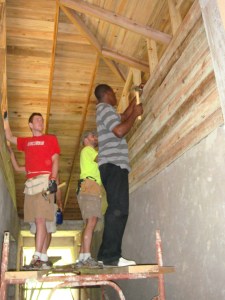 In 2009, JMP tackled the walls of the 5th cottage. The block was in place, but the siding to enclose each wall top had to be installed. This task was to take us three days. Instead, we finished early and were able to build a platform for a gravity-fed water tank that supplied water for the laundry facilities. In addition to these assignments, we were able to complete other general maintenance needs per Ms. Grant’s request.